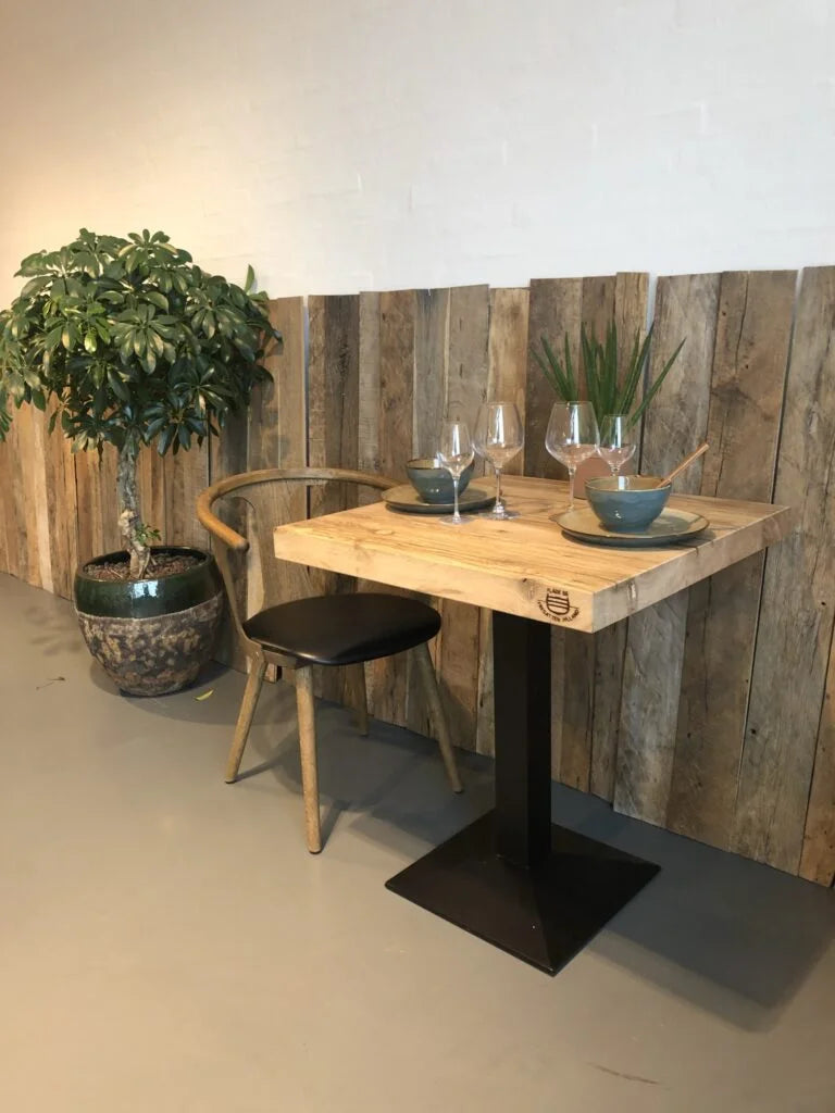 Alle vores caféborde fremstilles af genanvendt egetræ, der er omhyggeligt udvalgt og nænsomt bearbejdet, så det kan få nyt liv og skabe nye historier i jeres omgivelser. Det er muligt takket være egetræets høje kvalitet samt den grundige forarbejdning, vi udfører, inden møblet lander hos dig.